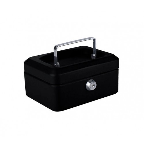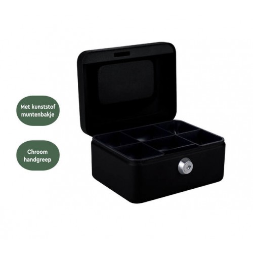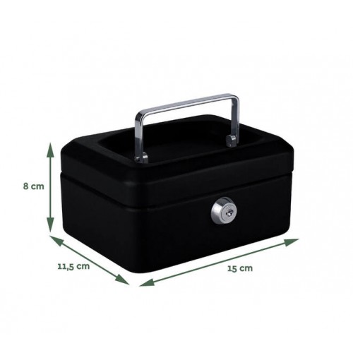 Geldkistje compact 150x115x80mm zwart poedercoat staal, met een roestvrij stalen handgreep.
