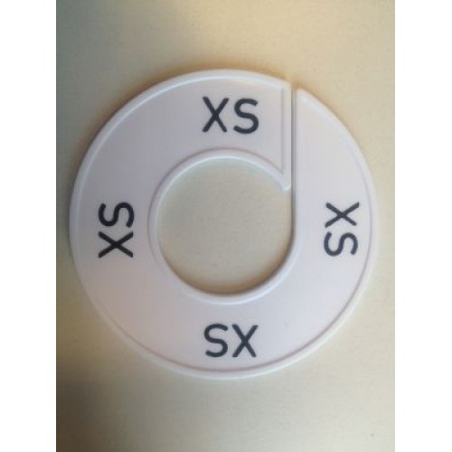 Maataanduider 9cm wit met zwarte opdruk XS.  Diameter van de maatring is 9cm, en de diameter van het gat is 4cm.